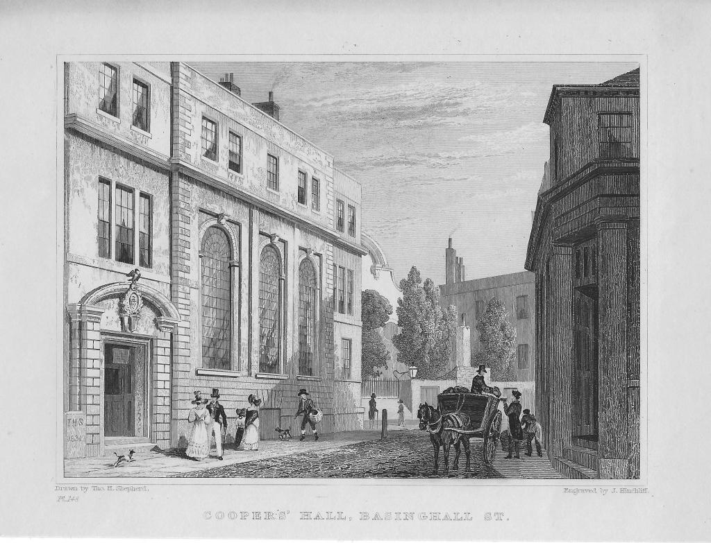 The Coopers Hall started out as a house called The Swan once owned by a John Baker who bequeathed the property and surrounding land to the Coopers guild in 1522. Twenty five years later the property became too small to comfortably conduct the guild’s business, so a new purpose built hall was constructed in an adjoining yard in 1547. The guild’s timing could not have been worse, because even before the building was completed an Act of Parliament decreed that all property bequeathed “for superstitious uses” was to be confiscated by the Crown. However, the act was passed because the Crown needed to raise funds as it was short of cash, so in 1550 all the City Companies recovered their confiscated estates by payment of a large sum of money. The Coopers’ share was £19 and this was raised by appealing to the members. The new hall lasted until the 5th September, 1666 when it was destroyed in the Great Fire of London. Luckily for the Coopers all of their Plate and company records had been removed the day before due to a refurbishment and stored in the house of Mr. Morris, the Upper Warden. The hall went through two further restorations on the same site until December 1940 when it fell victim to enemy bombing raids and it wasn’t until 1958 that the Coopers moved into their present home of Devonshire Square, after spending nearly twenty years holding their meetings in the halls of other Livery Companies.