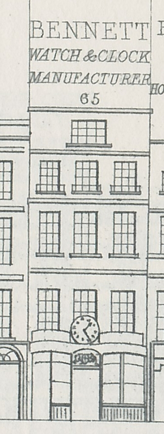 Although this rendered the building pleasing to the eye incorporating the court as a small arcade used to gain entry to his shop, Bennett seems to have overlooked the fact that during the hours of darkness the dimness of the court made it difficult to see into from Cheapside and in 1870 despite having a watchman on the premises through the night thieves managed to cut their way through the window glass and help themselves, waking the watchman twice in the process!