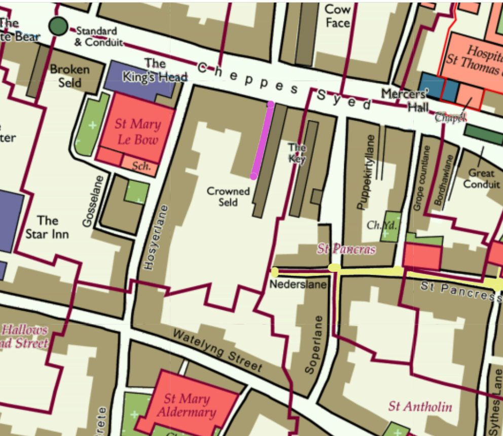 Looking at reconstructions of maps from the 13th century it looks as if your average punter set on an afternoon of galloping horses and grunting knights would have accessed the field by St Pancras Lane, somewhere in the region of Well Court. While the King who around the time that the map depicts was Edward I would enter the field via Cheapside through Crown Court.