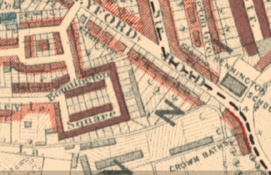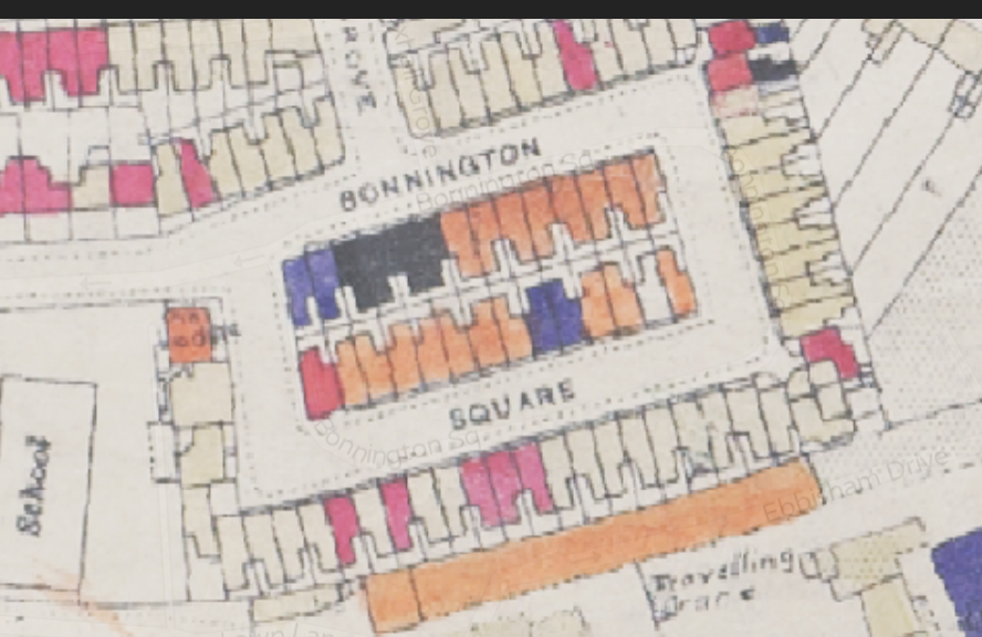 Booth’s map has the square marked as “Mixed, some comfortable, others poor“, which I would imagine had some bearing on the level at which the householders were employed at and also the size of the household. However, I think it’s safe to say that Bonnington Square was probably around average on the respectability scale, front steps being scrubbed regularly and the judicious hanging of undergarments on the washing line to avoid embarrassment. What marks it down as being different from a slightly superior upper working / lower middle class abode is the fact that the central area has houses on it when a slightly more up market square would have some sort of green space provided (obviously maximisation of profit against land space by the developer). All of the houses appear to only have back yards and no gardens. I would imagine that some residents relied on nearby allotments for fresh vegetables, but in an age where leisure time was limited I wonder how many hankered after a small green space of their own? If there were some they would have to wait for nearly seventy years and would need the help of the Luftwaffe to achieve it.