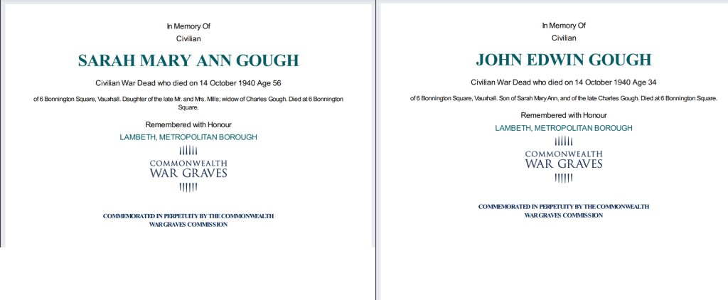 The Carters were Sidney a 30 year old builders labourer and his 36 year old wife, Edith. The Wise’s were Arthur a 35 year old carpenter and his wife Emily who was a year younger. The record also shows that one set of rooms was unoccupied and this is where fate plays it’s cruel hand. The two unfortunate souls who died in the raid were a mother and son, Widowed Sarah Mary Ann Gough (56) and John Edwin Gough (34). When the register was taken on September 29th 1939 the Goughs were living at 126 Strathyre Avenue, Croydon which is about 8 miles away. There is no way of knowing why the Goughs moved to the Square and subsequently lost their lives, sadly a check on the map for bomb damage around their Croydon address show it to be very light and nowhere close to their former home. We’ll never know why they alone were killed or if the Carter’s or the Wise’s were still living at the address in 1940, it’s just a very sad story in a massive list of similar stories throughout the world.