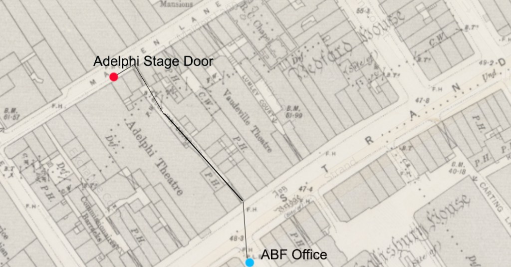 The next evening Prince presented himself at the offices of the Actors Benevolent Fund (ABF) which was across the road from the Adelphi asking for a handout, but was told that no payments could be made at that time. After a heated argument Prince left, crossing the Strand and heading through Bull Inn Court to emerge into Maiden Lane where he waited in a doorway opposite the Adelphi stage door.