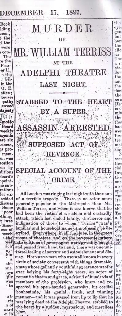 Soon Terriss arrived for the evenings performance of Secret Service. As he approached the door Prince sprang from his hiding place and stabbed Terriss to death. The murder became a sensation in the London press. At his trial Prince was found guilty but insane and sent to Broadmoor Criminal Lunatic Asylum, where he died in 1937. His relatively mild sentence was met with anger by the theatrical community, and Sir Henry Irving was quoted before the trial as saying that “Terriss was an actor, so his murderer will not be executed“.