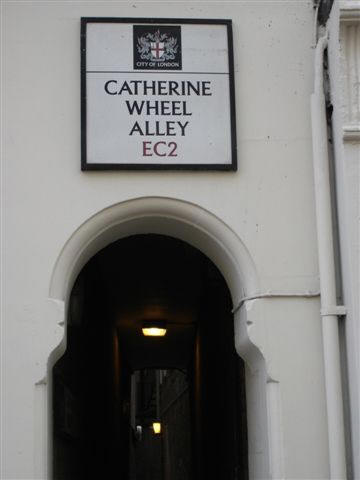 The majority of inns were designated for goods carriers, and one such was known as the Catherine Wheel. It appears to have existed from the late 1600s until 1911 when it was demolished. At that time it was the only remaining galleried coaching inn left in London. I pondered over the derivation of the name. St Catherine is commemorated in most christian religions and is probably Catherine of Alexandra who was martyred in the 4th century by being put to death on a spiked whee. It seemed an odd choice of name, however given it’s proximity to St Botholph’s church it’s not beyond credibility, that is until I read an entry by the 16th century chronicler John Stow which alluded to the “Cat and Wheel” and taking this further on the basis of how the London dialect gets corrupted it’s not fanciful to see this as the Cart and Wheel. Unfortunately I’ve struggled to find an image of the inn, even though it was demolished in the 20th century. The only indication of where it stood is the remnants of the alley that ran beside it.