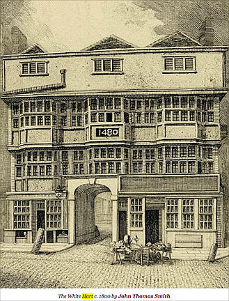 Bishopsgate without was also synonymous with several coaching inns that ran services into Essex. The White Hart Inn, was claimed to be the oldest, it has a date of 1480 displayed across its medieval façade in historic images, but is probably older than that date. Although rebuilt in 1829 following the creation of Liverpool Street, White Hart Court partially survives and is a reminder of the Inn’s galleried courtyard and the dense network of alleys which previously existed on the west side of Bishopsgate.