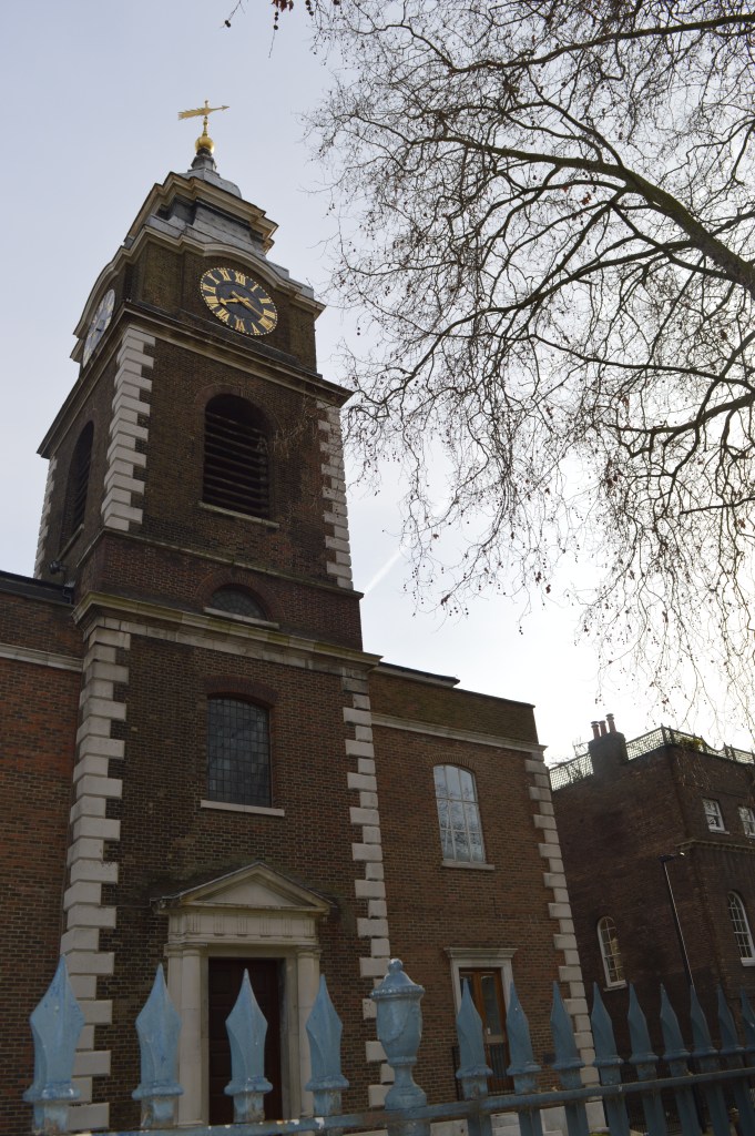 The map above shows the area in the 18th century. The Hermitage buildings have long disappeared, however the place is commemorated in the name Great Hermitage Street. The gardens shown to the east of the street were probably the fruit and vegetable gardens adjoining the hermitage. In the south east corner is the church and grounds of St John’s Wapping. St John’s Church was originally built as a chapel-of-ease, a church that is used to supplement the congregation of the parish church, in this case in the bordering neighbourhood of Whitechapel in 1617. St John’s became the parish church when Wapping was constituted as a separate parish in 1694. This makes it the oldest church in Wapping. The present remains date to around 1756, when the church was rebuilt by Joel Johnson, who had trained as a carpenter. The church was badly damaged in the Second World War, leaving only a rectangular shell. The tower was restored in 1964 by the London County Council and the remainder converted into flats in the 1990s.