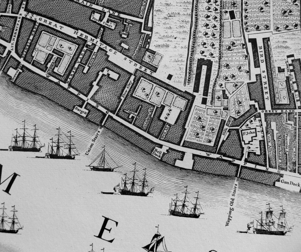 The area of Wapping sits to the east of the Tower of London. Back in Medieval times Wapping was a small strip of land bordered on one side by the River Thames and on the other by marshland. Over the centuries the marshes were drained and Wapping expanded northwards away from the river. In the 16th century the area was no more than a hamlet and there is evidence of quite a large Hermitage on its western side.
