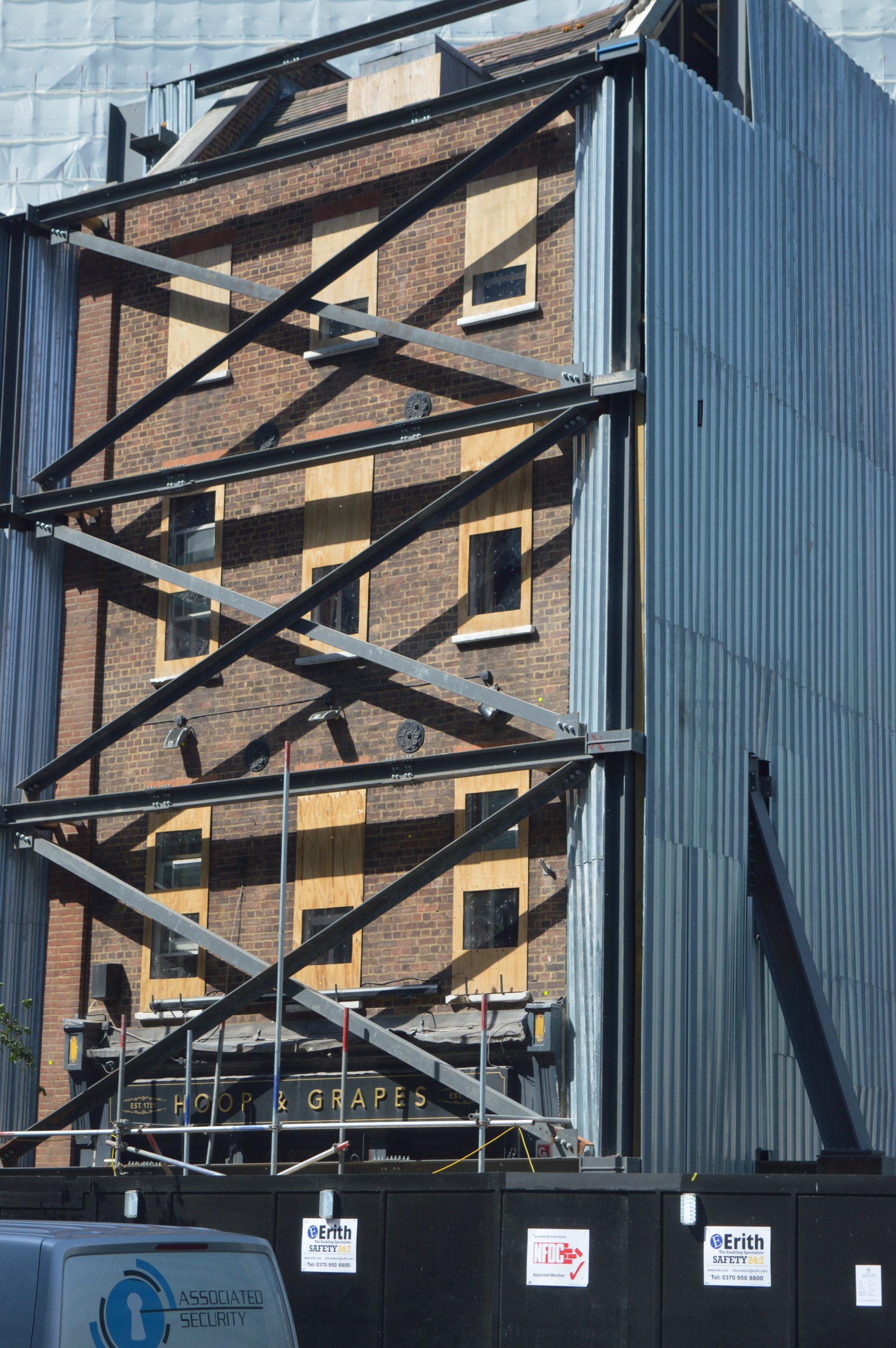 In the 1990s, it underwent several changes and was eventually closed down and scheduled for demolition. However, as the last surviving pub with a history of Fleet weddings, the pub was given a stay of execution and became a Grade II listed building. The surrounding buildings weren’t so lucky and so The Hoop was given a steel covering to protect it and help it stay up until the new buildings are in place.