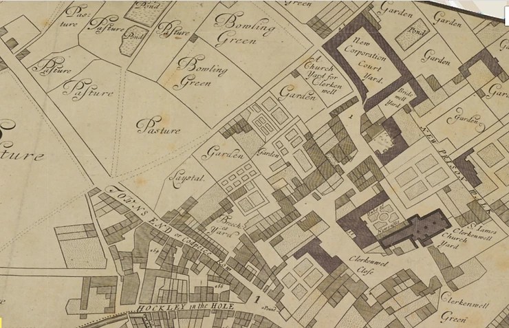Clerkenwell as a suburb was beyond the confines of the London Wall so was outside the jurisdiction of the puritanical City fathers. Consequently, “base tenements and houses of unlawful and disorderly resort” sprang up, with a “great number of dissolute, loose, and insolent people harboured in such ….. poor cottages, and habitations of beggars and people without trade, stables, inns, alehouses, taverns, dicing houses and bowling alleys”.