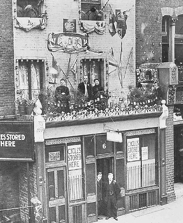 The shopfront, with its iron cresting, was built out over the forecourt in 1884. From 1896 until 2000 it was occupied by the Oliver family, dealers in cycles and later auto-spares. The photograph is from 1911 and the building is decorated to celebrate the coronation of George V and Queen Mary.