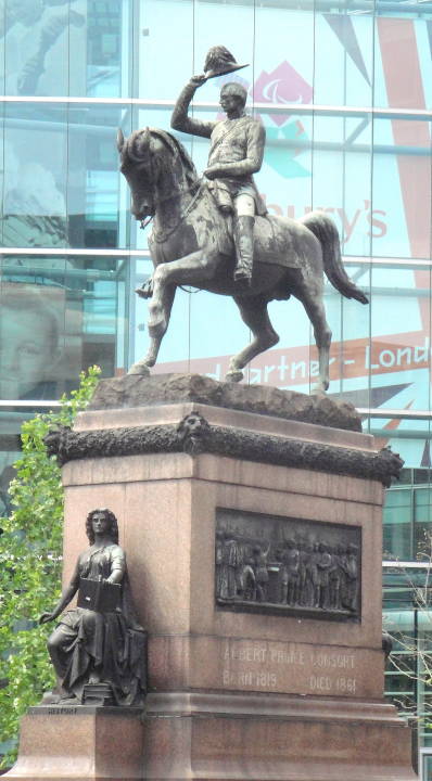 The statue situated at Holborn Circus shows the Prince astride his horse and as you’ll see he has removed his hat and is waving it in salute, supposedly to the merchants and council of the City of London. Given that the statue was erected some thirteen years after his death he couldn’t have had much of a say in the composition, and so the salute gesture could only have been arrived at by the vanity of the City Fathers who were footing the bill for it. Apparently, such an unbecoming royal gesture left the commissioners of the statue under no illusions that Queen Victoria was less than gruntled.