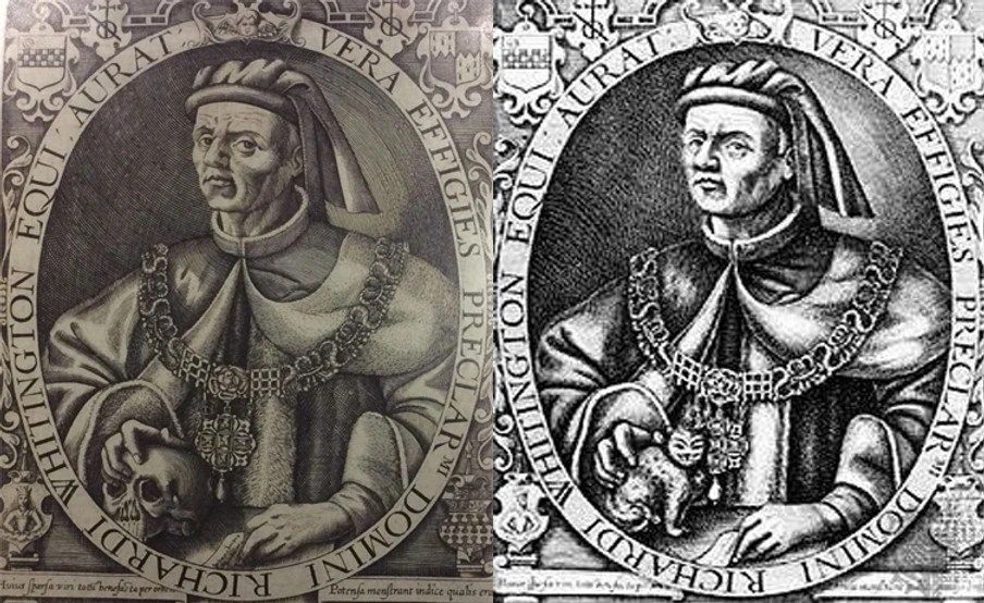 The engraving on the left is by Reginald Elstrack made in 1590 nearly seventy years after Whittington’s death. The print on the right in which the skull has been replaced by a cat is by Peter Stent produced in the 19th century, probably to meet popular expectations of the time.