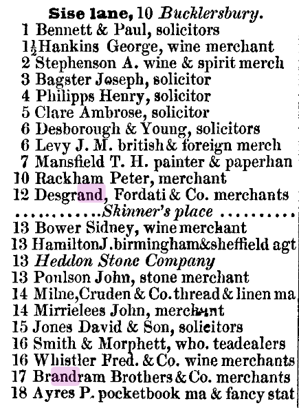 Today Sise lane is an ugly stub of an alley that you wouldn’t give a second glance to, but that’s not a modern thing. When Queen Victoria Street was opened in 1871 it truncated Sise Lane leaving it a desolate backwater. In an 1881 trade directory the only mention of it is as “Here is Sise Lane” and there are no listings for it. However looking back to a time before the redevelopment you see that the lane linked Pancras Lane and Budge Row, two important streets at the time. Early trade directories show that the lane was indeed a hive of activity.
