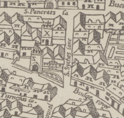 It also gave access to St Antholin’s church which I wrote about in An In(k)spiring Story. The Lane is much older that the map on the left of 1746 and shows up on the AGAS map of around 1540 below, where it is known as St Sythes Lane. How it became to be called so is not readily explainable. Referring to the fount of knowledge on all things medieval, the chronicler John Strype, he makes a link between the name Sythe or Sithes and the church of St. Benet Sherehog.