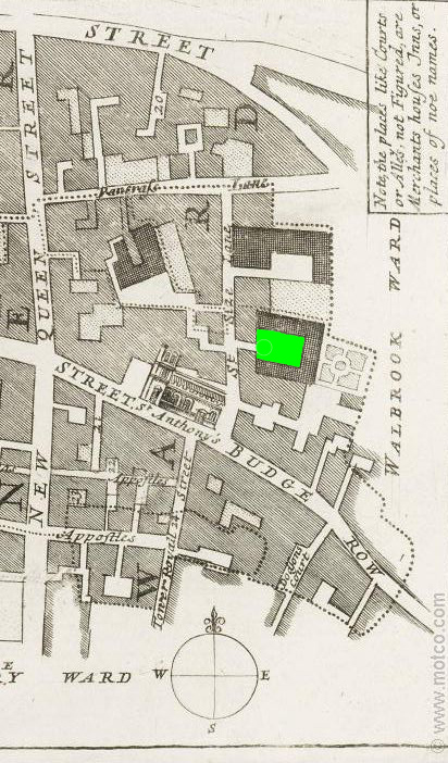It is known from records that many wealthy Skinners or Pellipars as they were known had large houses built in both Budge Row and Sise Lane. This interpretation of the street layout in the mid 1400s shows three large houses. The one highlighted is on the alignment of the 19th century Skinners Place and is thought have been owned in the mid 1400s by a wealthy fur trader called John Pasmer. The house and its gardens became known as Pasmer place and it is assumed that Pasmer had other properties in the City and rented this one out to those who could afford it.