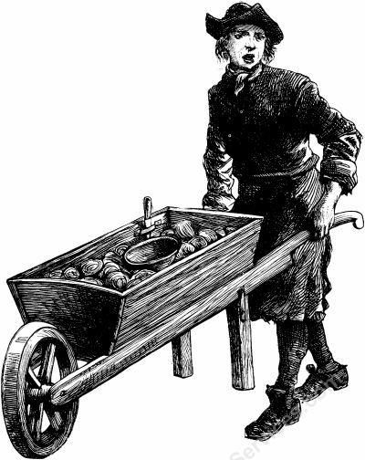 William trundles the barrow to a shop in Holborn and tries to sell the pots to the owner Ann Simmonds. She is suspicious when William says the pots are his and taking him firmly by the ear marches him off to the house of the local constable Mr Green. William has no desire to be held by the constable and promptly evades him and escapes, only to be apprehended the following day in Smithfield Market.