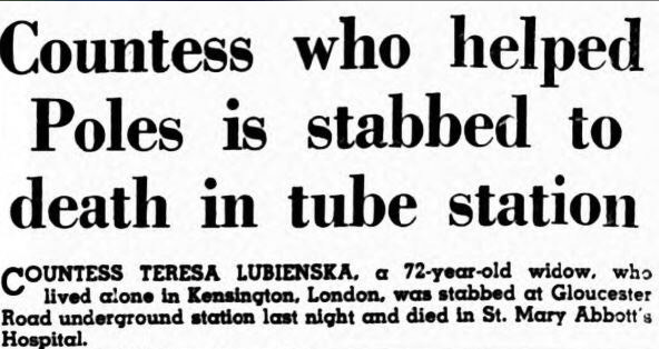 The victim of this attack was Teresa Lubienska, a 73-year-old Polish countess. She lived in a flat in Cromwell Gardens, Kensington but at one time had belonged to a Polish aristocratic family. She had lived a rather privileged but turbulent early life. Whilst a married woman in her thirties she lived on a large estate in south east Poland. The Bolshevik revolution of 1918 saw Lenin created a Polish Revolutionary Committee, PolRevKom, in effect a Bolshevik government for Poland. All titled lands were seized and when her husband Edward remonstrated with the occupying soldiers, they bayonetted him to death. Teresa and her two children were forced to flee taking only the possessions they could carry. She managed to place her son, Stanisław, at a military academy while she and her daughter lived in rather diminished circumstances, finally ending up in a small Warsaw flat. During her time there she became an active member of the Polish Red Cross. In 1939 the Germans invaded Poland and Stanislaw, by now a junior officer in the Polish army was mobilised to defend the country, but died in the first days of the fighting.