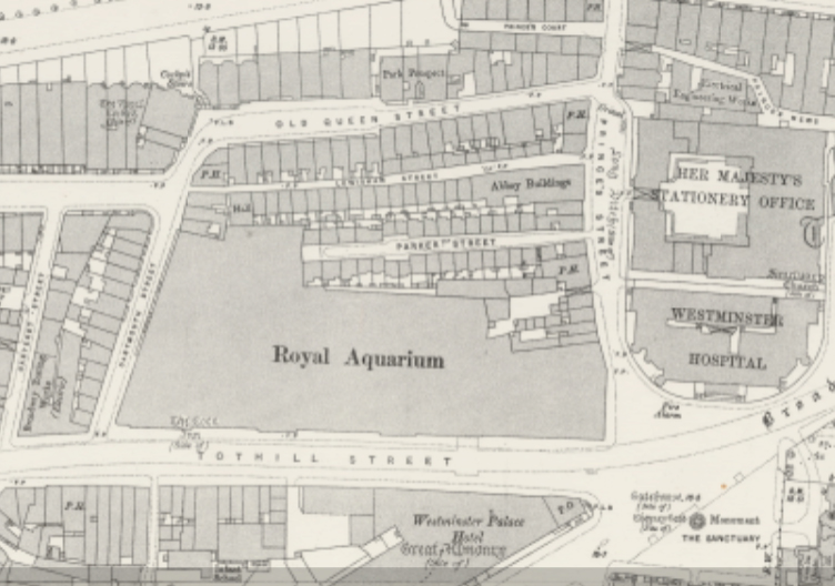Consulting my beloved 1890s OS map I found that the building that pre-dates Central Hall was known as the Royal Aquarium and judging by it’s footprint was a very large construction. Central Hall in it’s own way is quite grand, but the aquarium makes it a no contest in comparison. The aquarium was opened in 1876 but had closed and been demolished by 1903. How could such a large relatively new building be expunged from the landscape after only twenty five years or so?