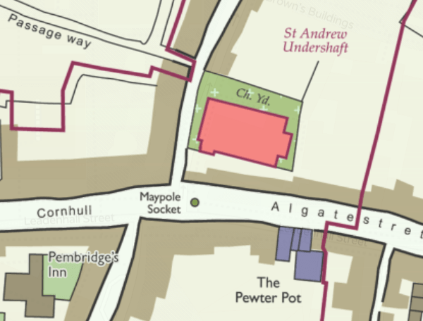 To make sense of these goings on we have to travel back to the 1300s. Opposite Lime Street or Lymestrete as it was known then sits the church of St Andrew’s Undershaft at the junction of Cornhull and Aldgatestrete. The church had been built around 1147 but by the 1300s had been demolished and rebuilt.