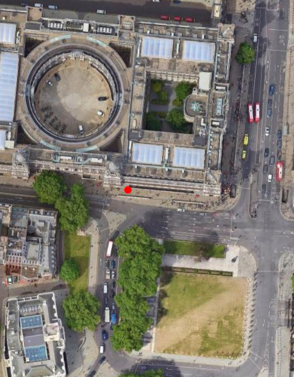 Before I shed light on it’s meaning I need to do the set up. The area in the picture above borders Parliament Square. In this aerial view the red dot marks the position of the second phone box you can see in the street scene. The building in the aerial view with the large rotunda at it’s centre houses the Treasury Building and also Revenue and Customs, today it goes by the name of GOGGS (Government Offices Great George Street). It was designed by the Scottish Architect John Brydon following a competition in 1898; the design was derived from Inigo Jones’ earlier design for a new Whitehall Palace. Before work started, the area looked rather different, as shown in the map below, the red dot denoting today’s site of the phone box again.