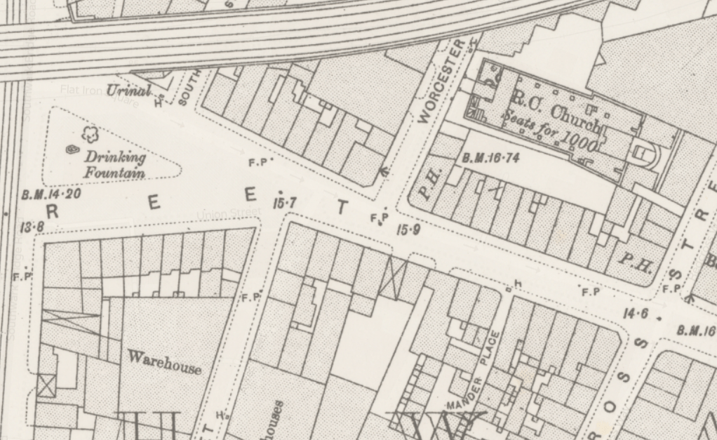 There’s a triangular area in the middle of the street known as flat iron square, a modern construct due to its shape, but it was once the location of a stone masons yard in the 1700s. Following development of the area it transformed itself it a small public garden and then in the 19th century it became the site of a drinking fountain and public toilet, now the cafe.