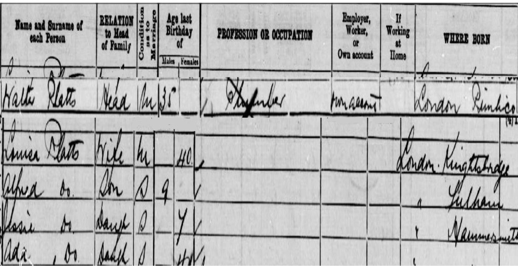 Not much is related about Platts in the court records but I did a bit of digging and found him in the 1901 census and it appears that he was actually a plumber by trade, living only a few hundred yards from Mr Crapper’s emporium on the Kings Road with his wife Louisa and their three children.