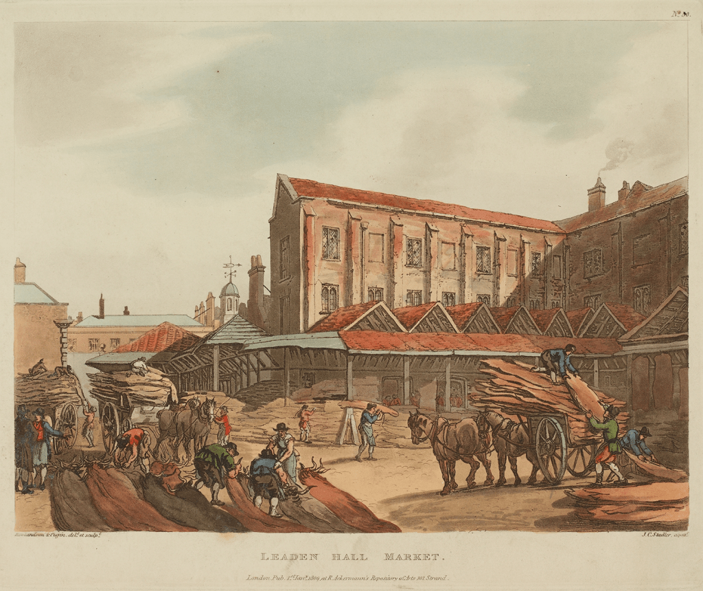 There was certainly a market there in the late twelve or early thirteen hundreds and that is when the name Leadenhall seems to come into existence. Sir Hugh Neville built himself a large house on the site with an adjoining large covered area, which was used as a general market. At the time it was known as Neville House, but as the years passed and the association with the Neville’s lapsed it began to take it’s name from the fabric of the building. It appears that the roof of the house and possibly the market were clad in sheets of lead and became known as the Leaden Hall.