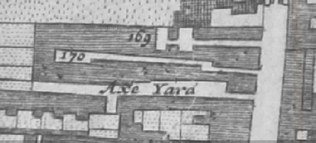 “I lived in Axe Yard having my wife, and servant Jane, and no more in family than us three.” Axe Yard was a street adjacent to modern day Downing Street, the residence of the Prime Minister. Downing Street wasn’t built until 1680, so the street that ran in it’s place was at the time of the diary entry knowns as Duffins Alley (170).