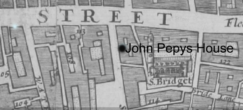 “Then went with my wife to my father’s, and in going observed the great posts which the City have set up at the Conduit in Fleet-street.” Pepys’ father was John Pepys, he had moved to London from Cambridgeshire when he was fourteen. He had his own Tailoring business just off Fleet Street, later run by his other son Tom. The shop and house where he lived and Samuel was born in stood in Salisbury Place.